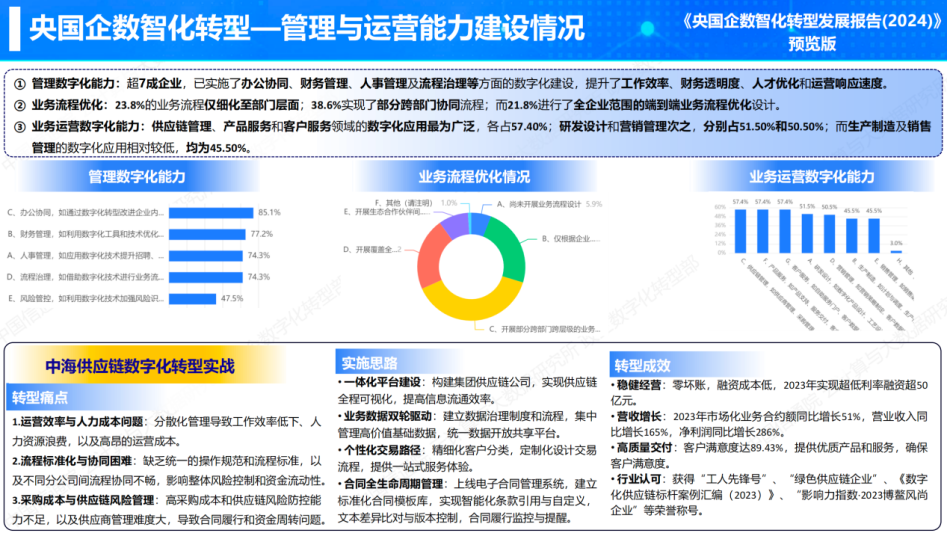 中海后天業(yè)務(wù)中的領(lǐng)潮供應(yīng)鏈管理平臺,致力于為建筑企業(yè)提供一站式的建材產(chǎn)品,不斷探索數(shù)字化場景應(yīng)用,促進(jìn)建筑業(yè)與數(shù)字化融合。在助力數(shù)字化轉(zhuǎn)型過程中以出色的技術(shù)表現(xiàn)、夯實(shí)的解決方案能力,以及作為央國企企業(yè)在建設(shè)數(shù)字中國戰(zhàn)略的落實(shí)和推進(jìn)過程中所承擔(dān)的使命和責(zé)任,被納入中國信通院《央國企數(shù)智化轉(zhuǎn)型發(fā)展報(bào)告(2024)》。